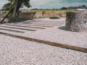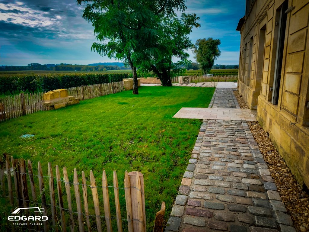 Aménagements paysagers soignés : pose de pavés anciens (fournis par AQUITER), traverses en chêne, stabilisateurs de graviers, bordures métalliques et murets en pierre de taille pour sublimer l’ensemble.