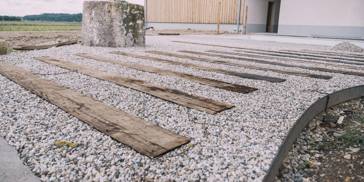 Aménagements paysagers soignés : pose de pavés anciens (fournis par AQUITER), traverses en chêne, stabilisateurs de graviers, bordures métalliques et murets en pierre de taille pour sublimer l’ensemble.