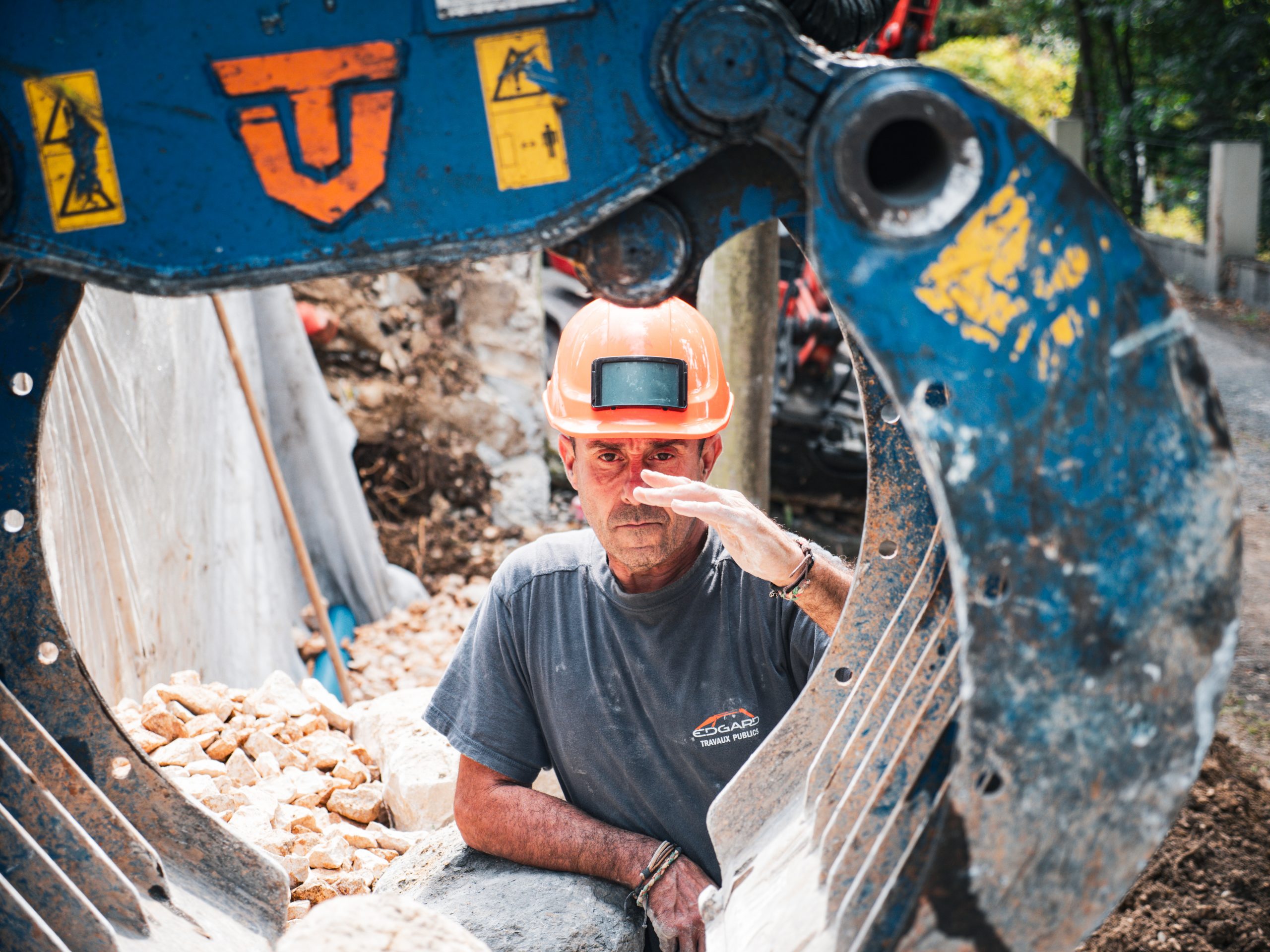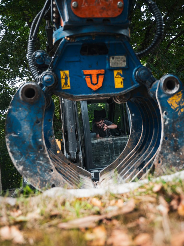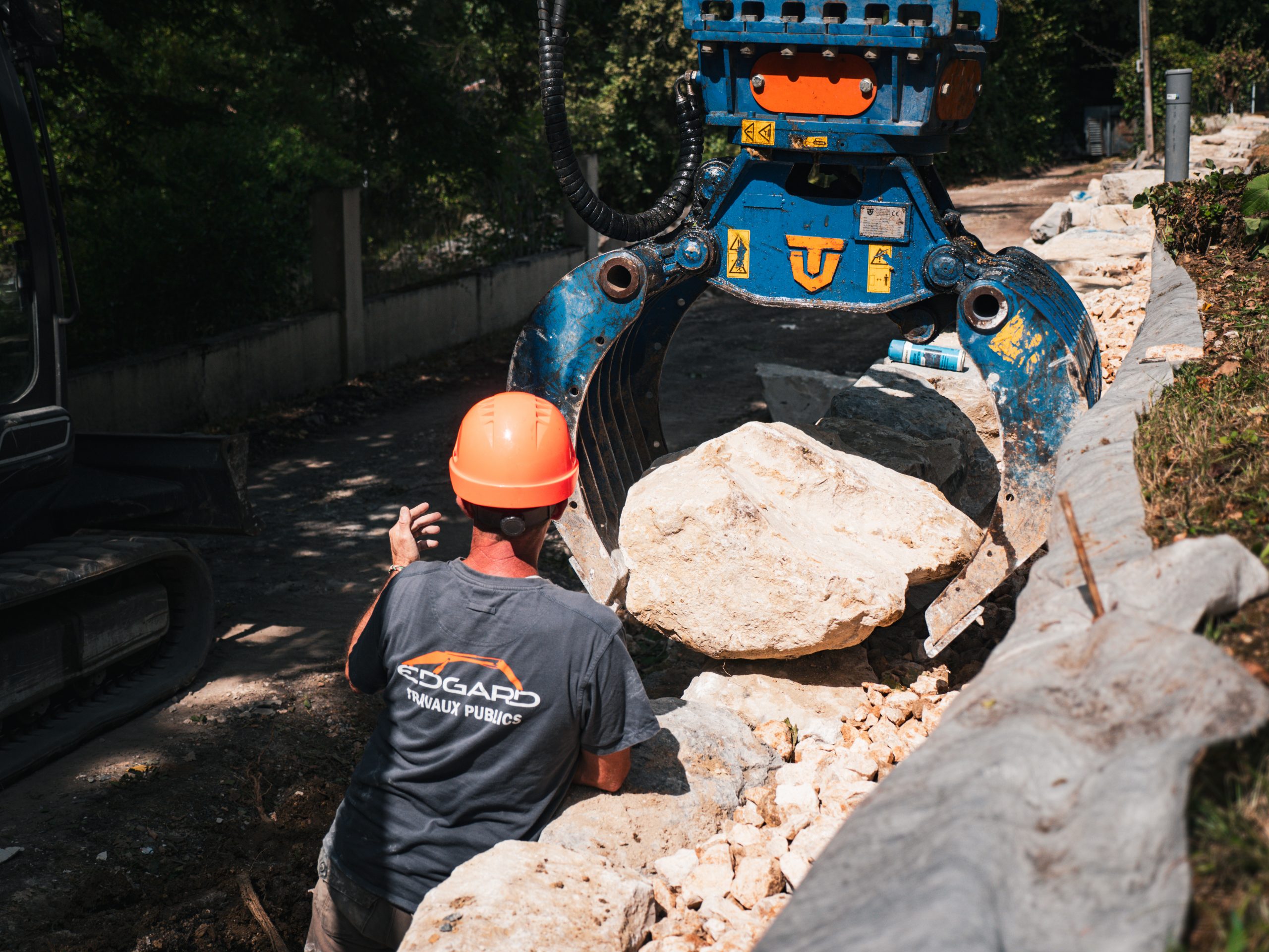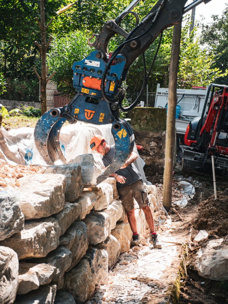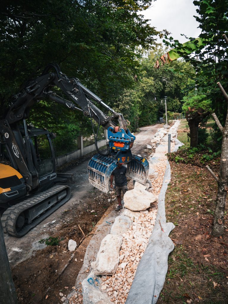 Pour mener à bien ce chantier, nous avons mobilisé notre pelle de 10 tonnes équipée d’une pince à enrochements, indispensable pour une pose précise des blocs.