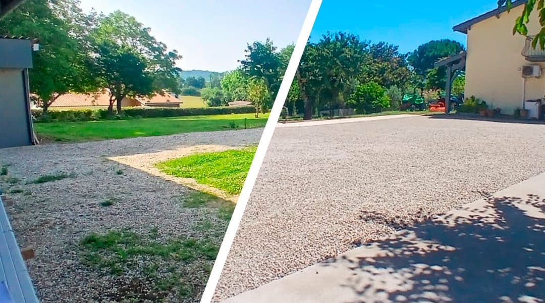 Terrassement de la cour suivi de la mise en place de graviers Garonne 6/10, un revêtement naturel, drainant et parfaitement intégré à l’environnement.